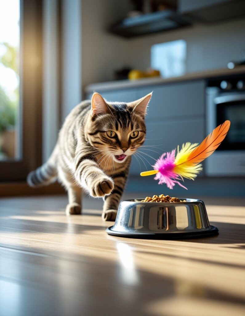 Use interactive toys, climbing trees, and puzzle feeders to mimic natural hunting instincts. These help your cat burn calories, sharpen focus, and enjoy mealtime more.