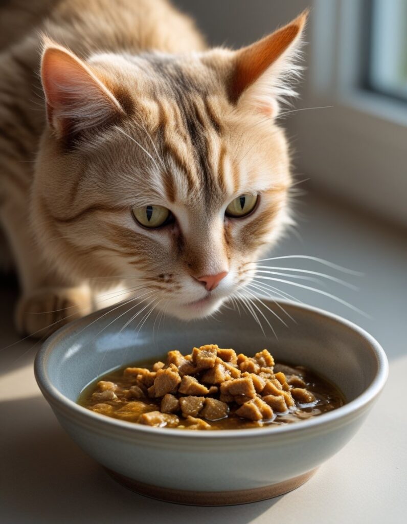 Image Prompt: A senior cat licking soft wet food from a shallow dish.